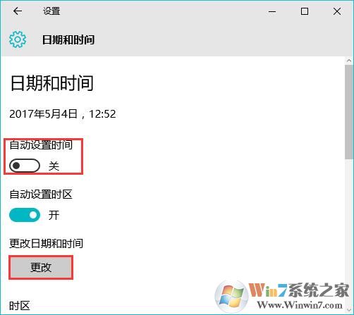 2、在下面將【自動設(shè)置時間】關(guān)閉,點擊【更改】;