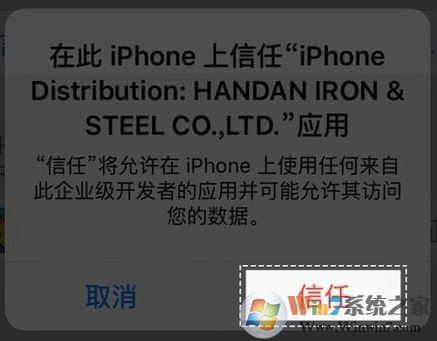 6、點(diǎn)擊彈出的彈框中的“信任“,如下圖所示,大功告成,可以愉快的進(jìn)入App!