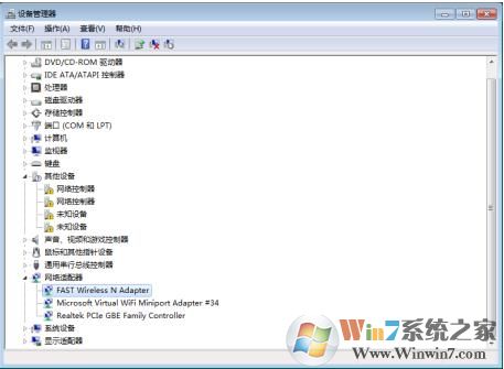 4、安裝完成后,可以去設備管理器確認下無線網(wǎng)卡是否安裝完成。如 網(wǎng)絡適配器中 有FAST 網(wǎng)卡,如下圖: