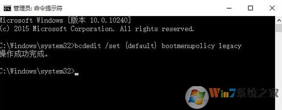 5、在命令提示符中輸入:bcdedit /set {default} bootmenupolicy legacy 按下回車(chē)鍵即可開(kāi)啟F8進(jìn)入安全模式的功能,如圖: