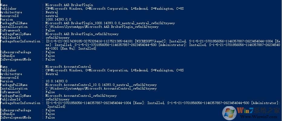 執(zhí)行后出現(xiàn)一張Appx包的列表,其中包含所有當(dāng)前系統(tǒng)下可以檢索到的Appx包,這些包用于部署對(duì)應(yīng)的應(yīng)用。每個(gè)包的具體信息會(huì)全部列出,包括安裝位置、包的完整名稱等。