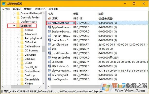 2、依次展開“HKEY_CURRENT_USER\SOFTWARE\Microsoft\Windows\CurrentVersion\Explorer”,找到“AltTabSettings”,如圖: