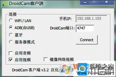 3、先運(yùn)行手機(jī)端。然后在PC上運(yùn)行這個(gè)bat文件一次,Win7旗艦版再運(yùn)行DroidCam客戶端,選擇連接方式為“ADB(由USB)”,點(diǎn)擊Conect。如果不運(yùn)行bat或者設(shè)置的端口與bat內(nèi)的不一致,會(huì)有錯(cuò)誤提示。