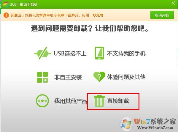 6、再點(diǎn)擊直接卸載,360手機(jī)助手就從你的電腦中卸載完成了。