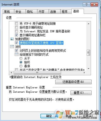 2、然后到高級(jí)選項(xiàng)卡下,找到加速的圖形,把下面的“使用軟件呈現(xiàn)而不使用GPU呈現(xiàn)”打上勾,然后重啟IE