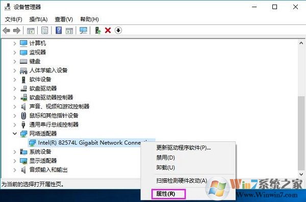 2、在設(shè)備管理器窗口,找到并展開電腦網(wǎng)卡,對著它單擊鼠標右鍵,菜單中選擇“屬性”;