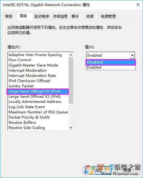 3、在網(wǎng)卡屬性對話框,點擊切換到“高級”選項卡界面,在“屬性”列表中,點擊選中“Large Send Offload v2(IPv4)[大型傳送分載 v2(IPv4)]”,在窗口右側(cè),將“值”設(shè)置為“Disabled(關(guān)閉)”,然后點擊底部確定按鈕。