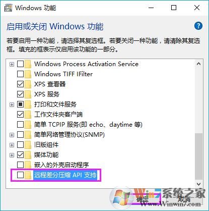 3、在Windows功能窗口,找到“遠程差分壓縮API支持”,取消前面的勾選后,點擊確定,隨后會出先一個關(guān)閉進度提示窗口,別管他,之后需要重啟電腦。