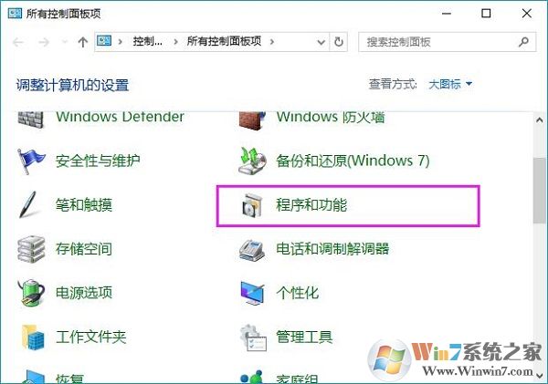 1、在控制面板窗口,大圖標查看方式下,找到并點擊“程序和功能”;