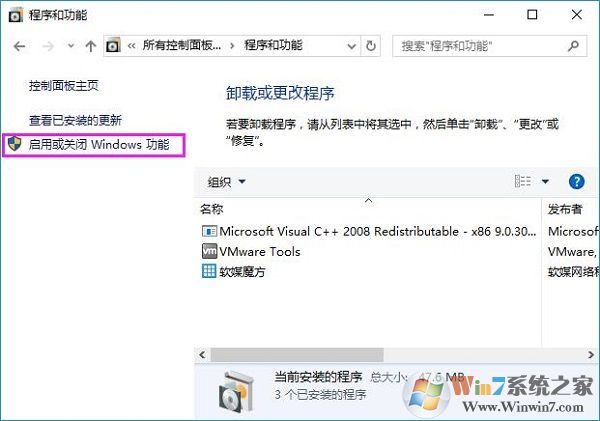 2、在程序和功能窗口,點擊左側(cè)“啟用或關(guān)閉Windows功能”。