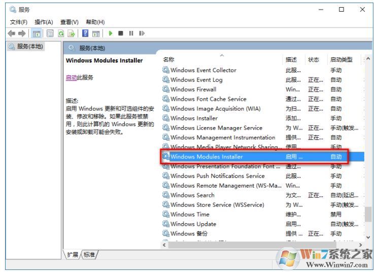 2、在服務(wù)(本地)窗口找到:Windows Modules Installer 服務(wù),查看是否被禁用;
