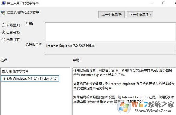 3、彈出窗口中,點擊已啟用,在下方輸入ie版本字符串中輸入“Mozilla/4.0 (compatible; MSIE 8.0; Windows NT 6.1; Trident/4.0) ”,點擊確定即可,如下圖所示: