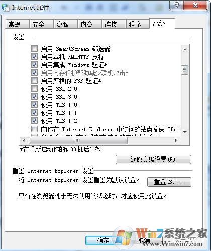 2、在internet選項中,切換到高級選項卡下,勾選SSL 3.0、TLS 1.0、TLS 1.1 和 TLS 1.2 并確定;