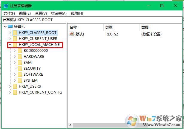 2、進(jìn)入注冊(cè)表,找到“HKEY_LOCAL_MACHINE”,請(qǐng)根據(jù)下圖指示,點(diǎn)紅色框內(nèi)箭頭所示的文件夾前的+按扭