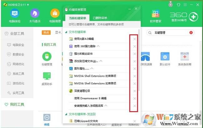 右鍵菜單管理軟件可以很容易的刪除,這里推薦360中的右鍵菜單管理工具。