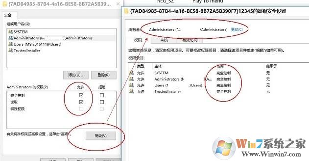 1、首先進入Win10注冊表,定位到HKEY_CLASSES_ROOT\CLSID\{7AD84985-87B4-4a16-BE58-8B72A5B390F7},屬性-----高級,將該主鍵的所有者設置為Administrators組,同時將Administrators組設置為完全控制權限。。