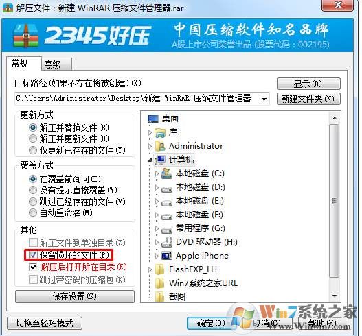 3.在從壓縮文件中解壓窗口的~常規(guī)菜單~其他選項框~保留損壞的文件復(fù)選框打勾;