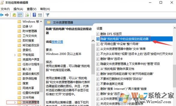3、在本地計算機策略,用戶配置,管理模板,Windows組件,Windows資源管理器,找到“隱藏我的電腦中的這些指定的驅(qū)動器”;