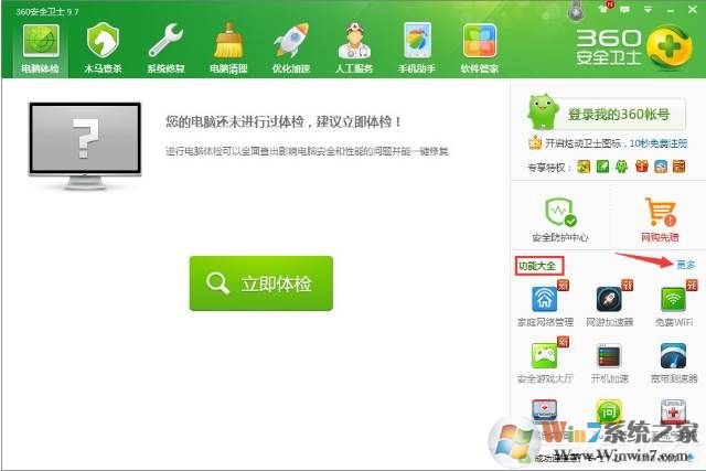 1、打開360安全衛(wèi)士,在功能大全右側(cè)點(diǎn)擊“更多”,就可以看到LSP修復(fù)功能;