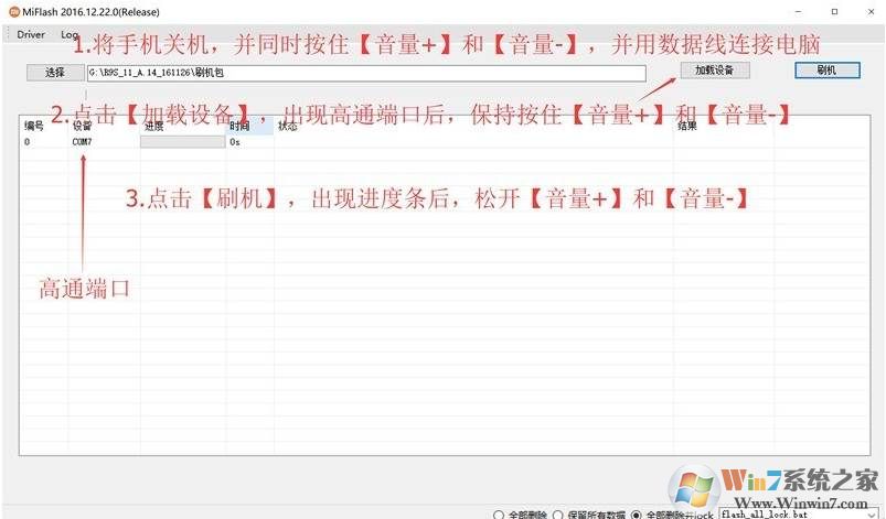3、手機(jī)關(guān)機(jī)后,按音量+和音量一,數(shù)據(jù)線(xiàn)連接電腦,點(diǎn)擊加載設(shè)備,出現(xiàn)高通端口后,保持安住音量+和音量-,點(diǎn)擊刷機(jī),出現(xiàn)進(jìn)度條后松開(kāi)按鍵。