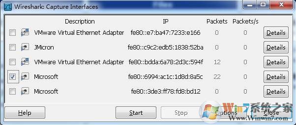 點(diǎn)擊Caputre->Interfaces.. 出現(xiàn)下面對(duì)話框,選擇正確的網(wǎng)卡。然后點(diǎn)擊"Start"按鈕, 開始抓包