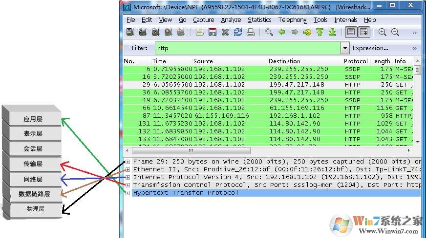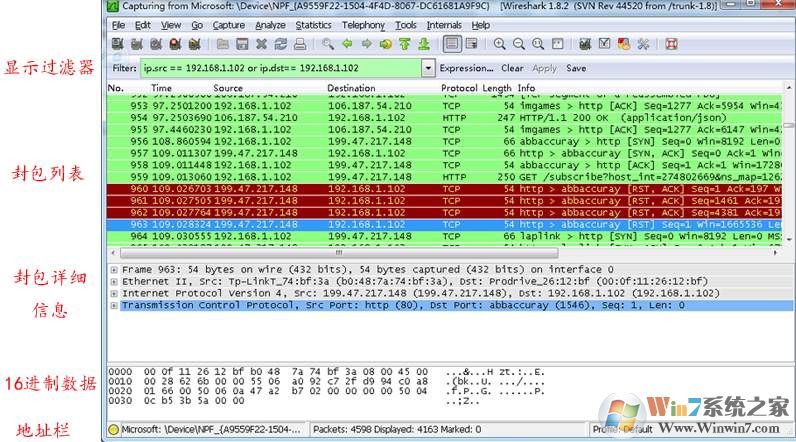 比如 ip.src ==192.168.1.102 顯示源地址為192.168.1.102,