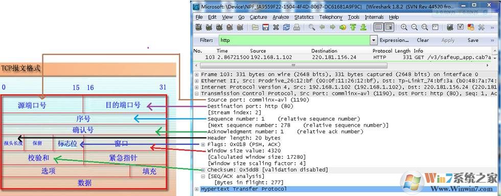 從下圖可以看到wireshark捕獲到的TCP包中的每個(gè)字段。