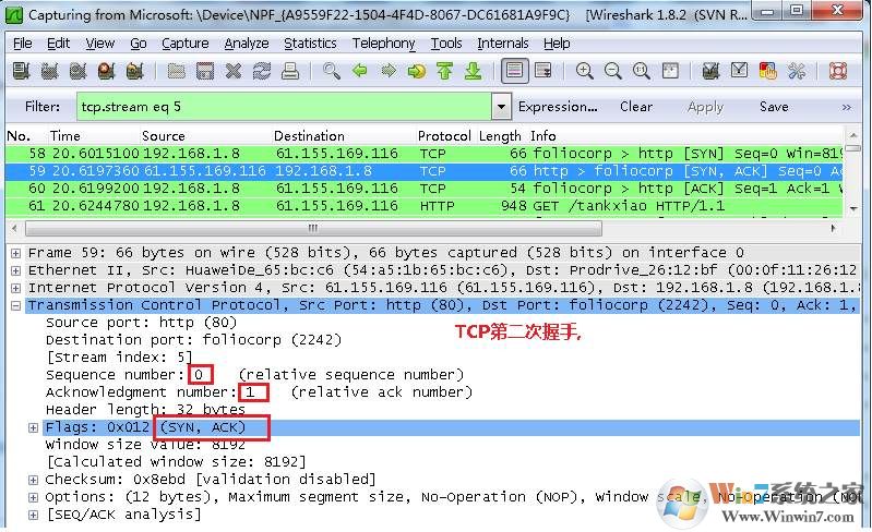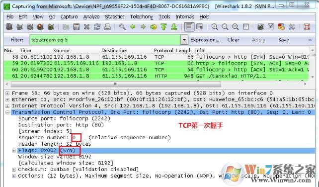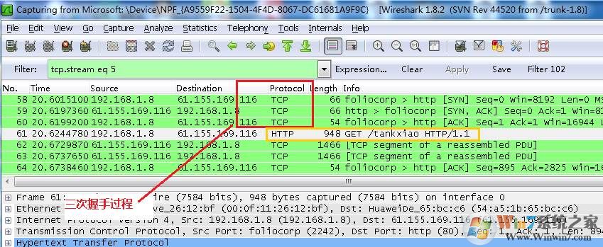 圖中可以看到wireshark截獲到了三次握手的三個(gè)數(shù)據(jù)包。第四個(gè)包才是HTTP的, 這說(shuō)明HTTP的確是使用TCP建立連接的。