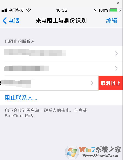 6、找到號(hào)碼點(diǎn)住 ——左邊滑動(dòng),取消阻止,即可(或,點(diǎn)擊編輯,再點(diǎn)減號(hào) 就可以了!)