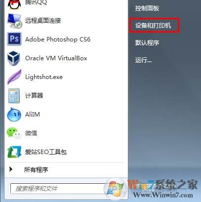 1、以Win7系統(tǒng)為例,首先從開始菜單進(jìn)入“設(shè)備和打印機(jī)”;