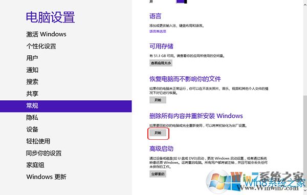第三步、在新的窗口的左側(cè)選擇“常規(guī)”,點擊右側(cè)的“刪除所有內(nèi)容并重新安裝Windows”下的“開始”。