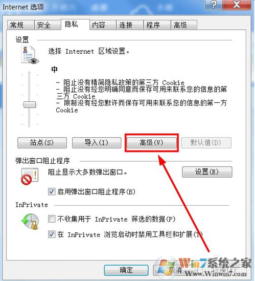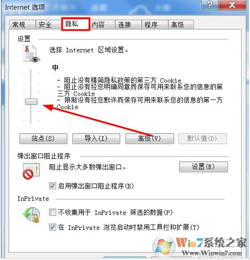 2、打開“internet選項”后,選擇“隱私”按鈕,設(shè)置為中,如圖所示、