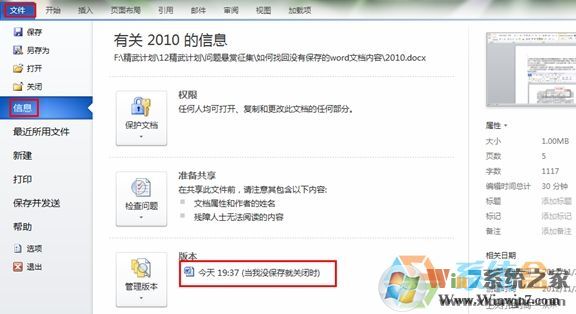 2、單擊:文件--信息--找到右邊“版本”如下圖的一個(gè)文件版本,單擊這個(gè)版本即可,按照?qǐng)D示操作即可: 點(diǎn)擊未保存的文檔即可恢復(fù)文檔。