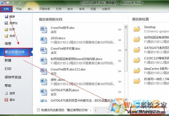 2、單擊最近所用的文件;