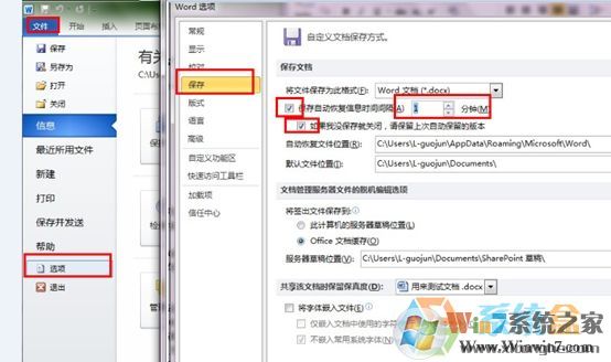 4、確保右側(cè)的保存選項(xiàng)中,“保存自動(dòng)恢復(fù)信息時(shí)間間隔”與“如果我沒有保存就關(guān)閉,請(qǐng)保留上次自動(dòng)保留的版本”兩項(xiàng)前的復(fù)選框被選中。(以Word 2010為例,默認(rèn)自動(dòng)保存時(shí)間間隔10分鐘,圖中修改為1分鐘了,如下圖所示:)