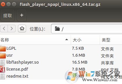 4、提取后得到兩個目錄usr、LGPL和三個文件libflashplayer.so、license.pdf、readme.txt,如圖所示:
