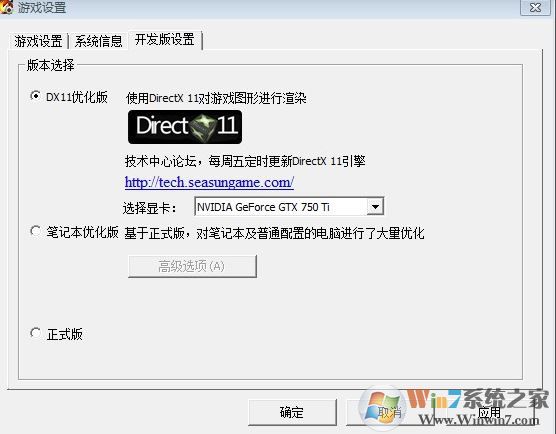 6、打開點(diǎn)擊設(shè)置,可以看到比正式版 多了一個開發(fā)版選項(xiàng),打開并選擇你的顯卡,并點(diǎn)擊確定,如圖: