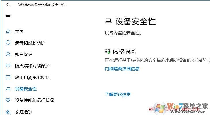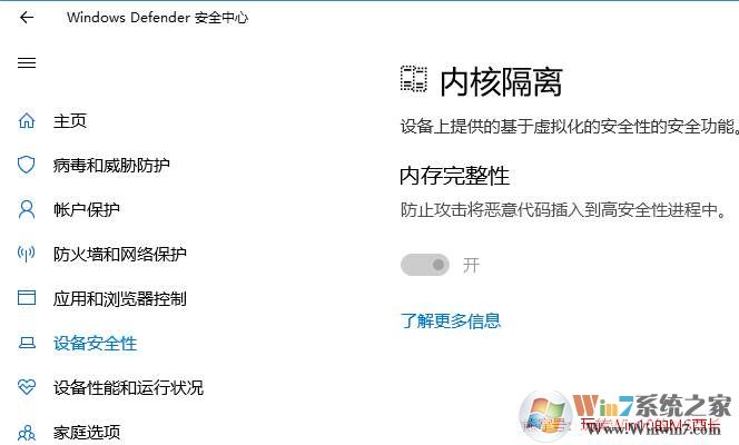 2、點(diǎn)擊“內(nèi)核隔離詳細(xì)信息”打開(kāi)“內(nèi)核隔離”設(shè)置頁(yè)面。如圖: