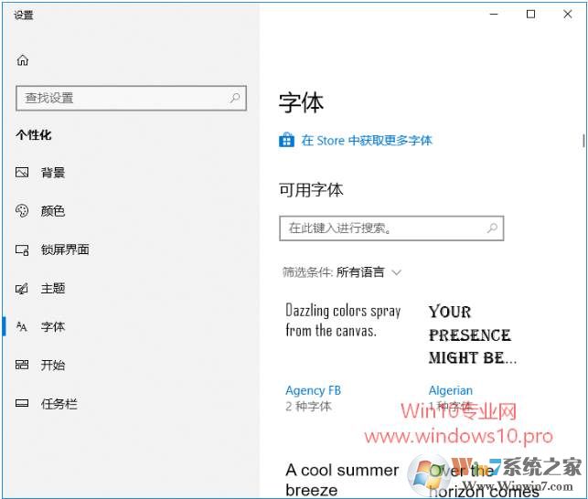 1、首先進(jìn)入“設(shè)置 - 個性化 - 字體”界面,在頂部即可看到“在Store中獲取更多字體”鏈接。如圖: