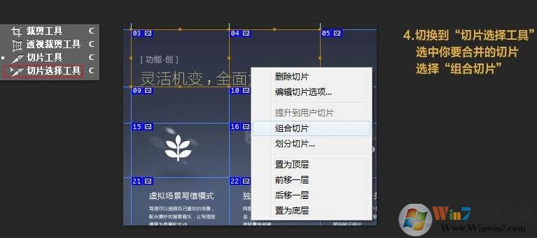 5、切換到“切片選擇工具”選中你要的合并的切片,選擇組合切片