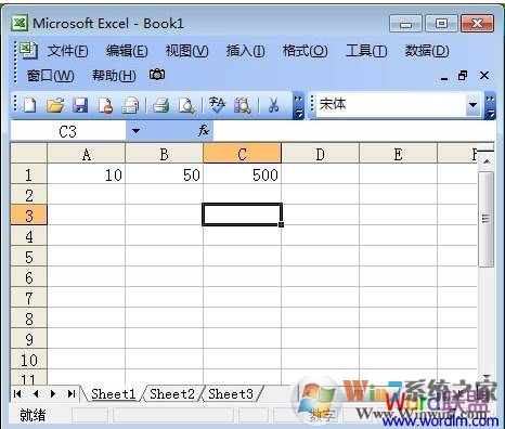 ③現(xiàn)在我們在“A1”和“B1”單元格中輸入需要相乘的數(shù)據(jù)來進行求積,如下圖,我分別在A1和B1單元格中輸入10和50進行相乘,結(jié)果在C1中就會顯示出來,等于“500”。