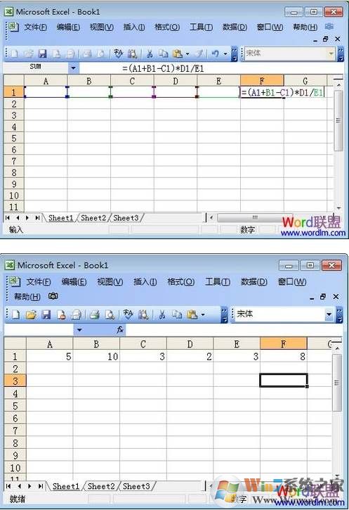 ②好了,知道公式了,我們是不是應該馬上來在Excel中的“F1”中輸入“=(A1+B1-C1)*D1/E1”。