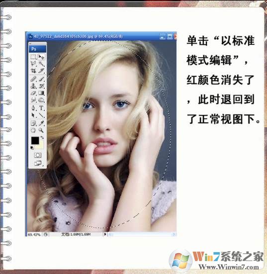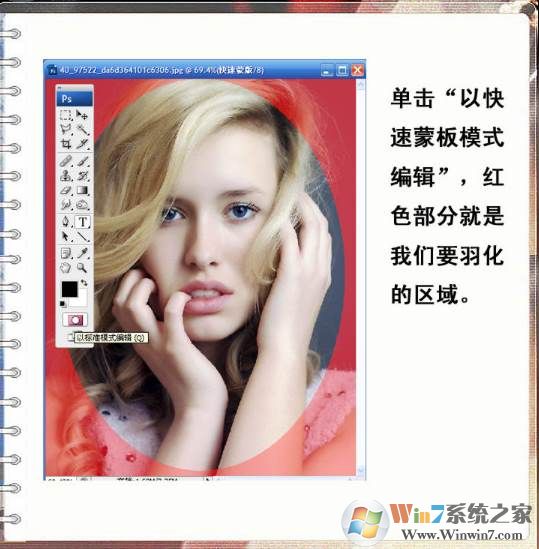 2、用“以快速蒙板模式編輯”工具,出現(xiàn)的紅色部分就是我們要羽化的區(qū)域。