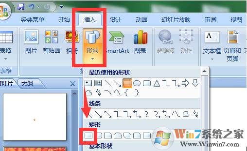 1、打開ppt軟件,然后點(diǎn)擊“插入”,選擇“形狀”,點(diǎn)擊“矩形”里的長(zhǎng)方形圖標(biāo);