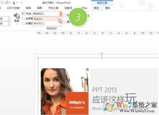 3、在“視頻工具”中,“播放”選項(xiàng)卡,將“開始”設(shè)置自動(dòng)。(下圖3處)即可實(shí)現(xiàn)播放PPT時(shí)候,自動(dòng)播放視頻。