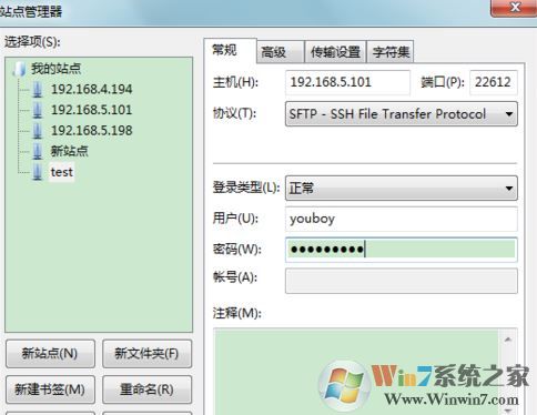 2、在站點(diǎn)管理器界面新建站點(diǎn),填寫主機(jī)、端口,選擇正確的協(xié)議,登錄類型選正常,再填寫用戶名、密碼,再點(diǎn)擊“連接”,見下圖: