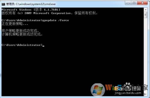 2、打開DOS命令符,然后輸入gpupdate /force 前兩個步驟的操作含義是刷新策略組;詳情參考下圖