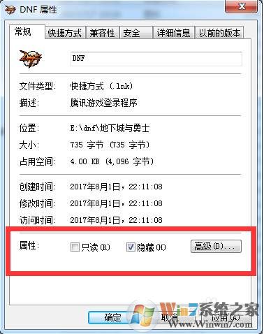 5、把命名為地下城與勇士的圖標改為DNF,然后右擊屬性,選擇隱藏;詳情參考下圖