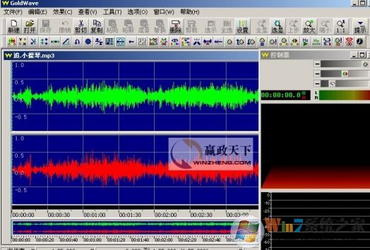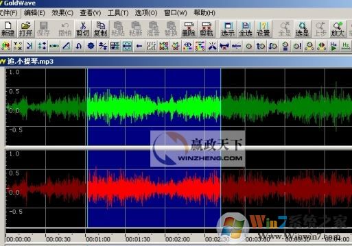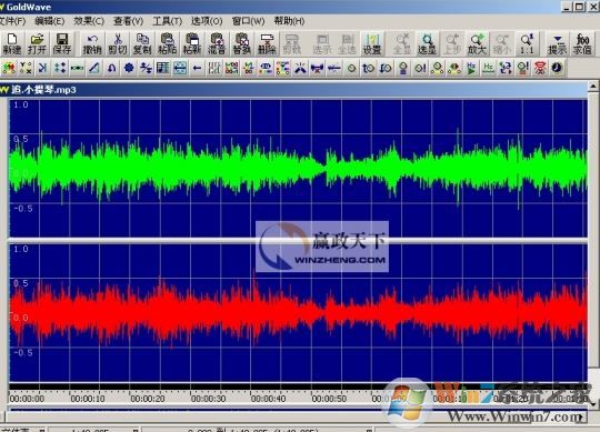 4、我們打開的是一個立體聲文件,所以GoldWave會分別顯示兩個聲道的波形,綠色部分代表左聲道,紅色部分代表右聲道,主界面最下方的狀態(tài)欄是當(dāng)前音頻文件的一些狀態(tài),比如時間、頻率等;