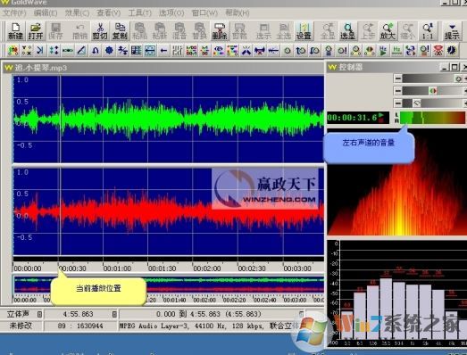5、我們點擊右邊的控制器中的“播放”按鈕開始播放此時就可以看到主界面中會有一條平移的灰線,這個代表當(dāng)前播放的位置,在控制器中可以看到具體的波形,以及左右聲道的音量等信,如圖: